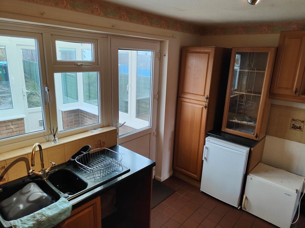One and a half bowl sink unit adjoining work surface with wood fronted cupboards and drawer unit below. Space and plumbing suitable for washing machine under work surface. Space for cooker, matching eye level cupboards, part tiling, tiled flooring, double glazed window. Cupboard concealing gas boiler, double glazed door opens to:-