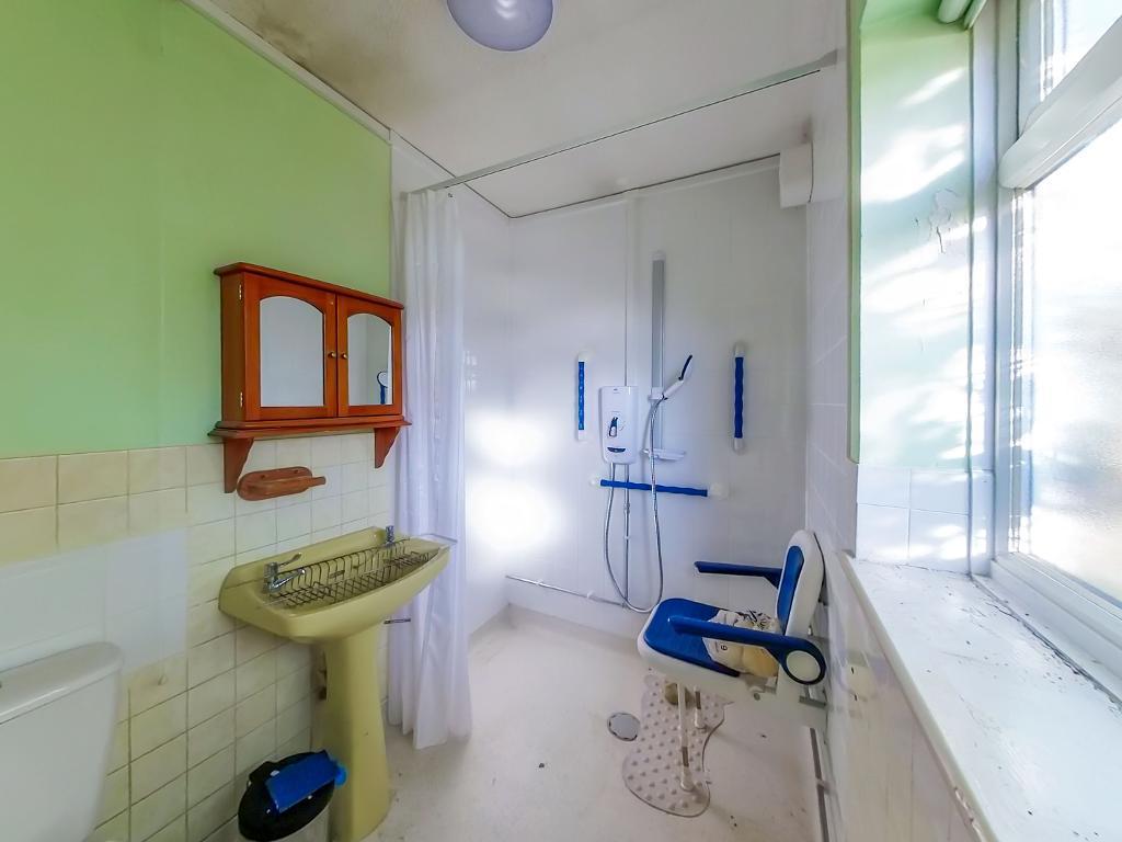 Mira shower, mainly tiling to walls, pedestal wash hand basin, low level WC, electric wall heater, double glazed window, non-slip style flooring.