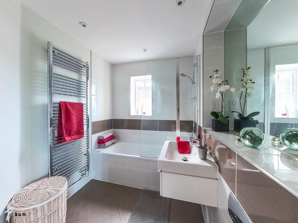 Panelled bath with shower spray attachment and shower spray guard, wash hand basin set into vanity unit, WC, fitted mirror, part tiling, shaver panel, double glazed window, radiator.
