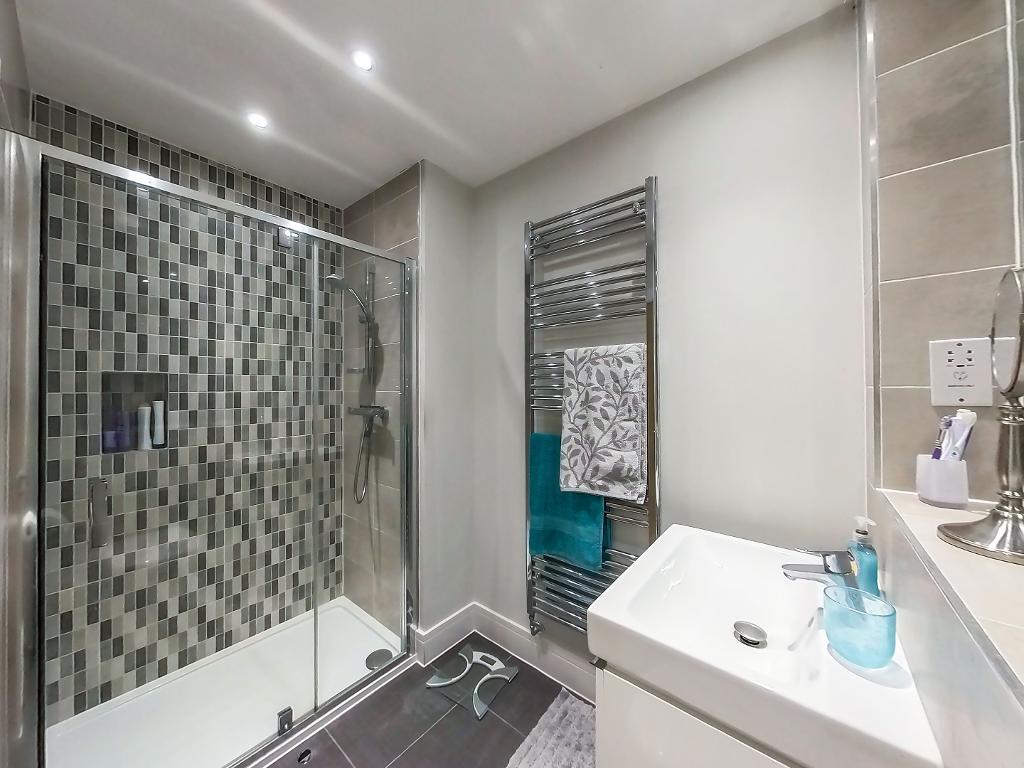 WC, wash hand basin into vanity unit, radiator, tiled shower cubicle, fitted mirror, spotlights, shaver panel.