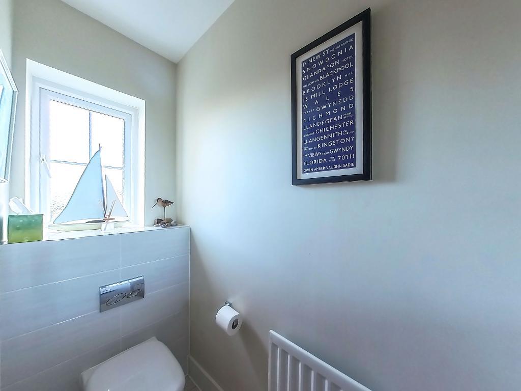 WC, wash hand basin with tiled splash back, radiator, tiled flooring, double glazed window.