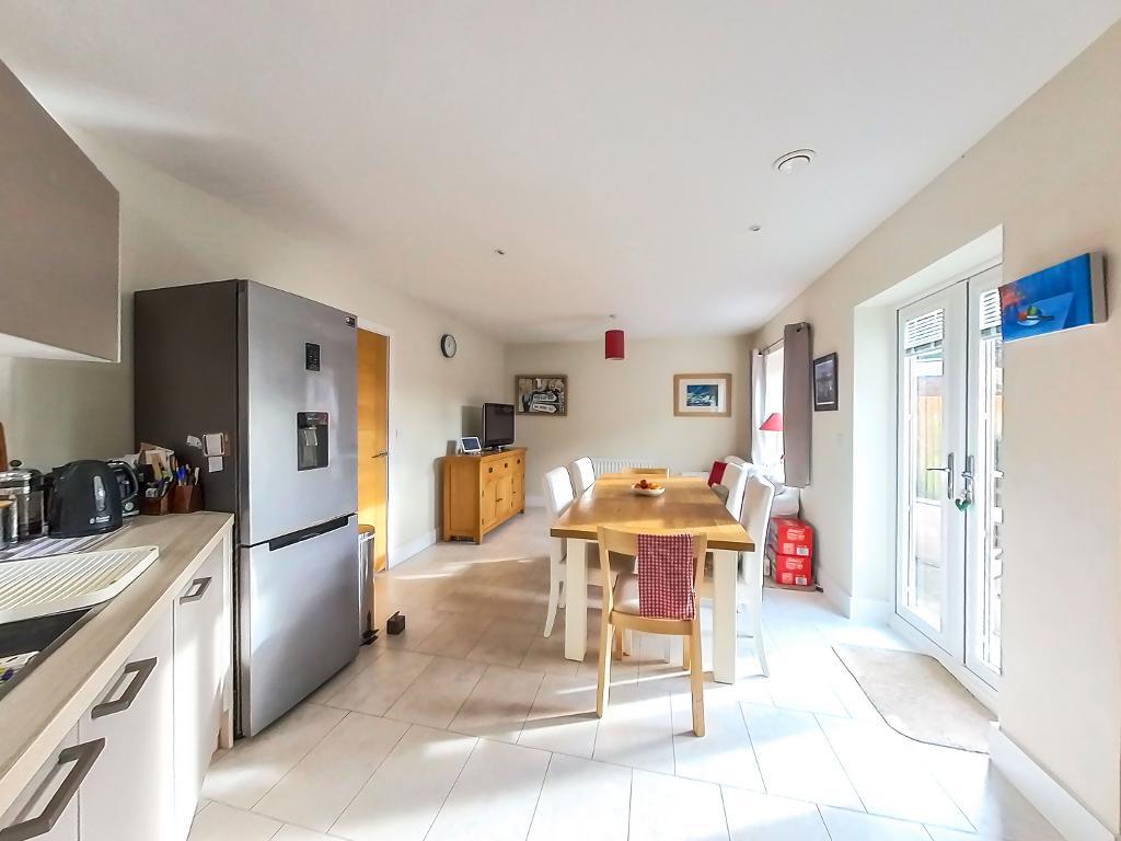 One and a half bowl sink unit with mixer tap adjoining work surface with matching cupboards and drawer unit under. Space and plumbing suitable for washing machine, built-in electric hob with concealed extractor, built-in electric oven, space for upright fridge/freezer, matching eyelevel cupboards with concealed lighting. Radiator, double glazed window and double glazed doors open onto rear garden.
