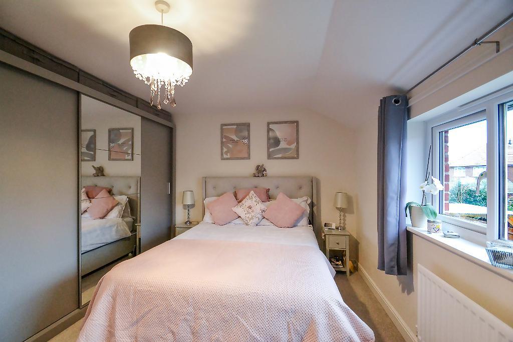 Wardrobe cupboard with triple sliding doors with centre door mirror fronted with hanging rails and fitted shelving. Double glazed window view over rear garden, radiator.