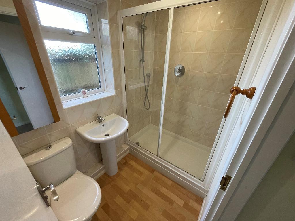 Panelled bath with independent Triton shower unit. Pedestal wash hand basin, WC, part tiling, double glazed window, mirror fronted medicine cabinet.