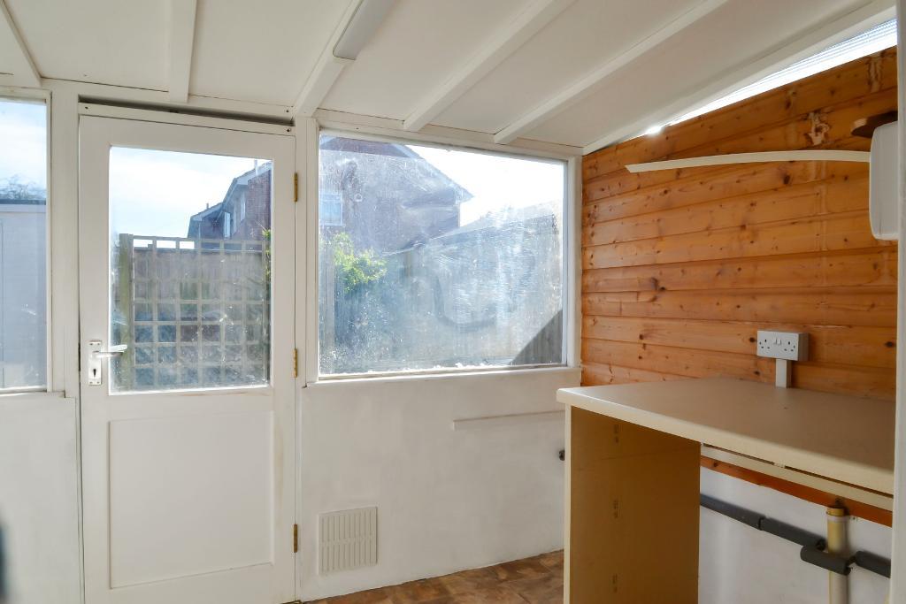 Fitted work surface, power point, space and plumbing for washing machine, single glazed window and part glazed opening onto rear garden.