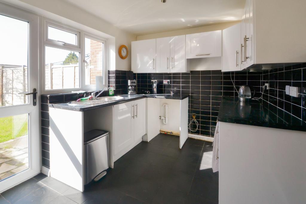 Single drainer stain steel sink unit adjoining work surface with cupboards under and having space and plumbing suitable for washing machine and slimline dishwasher. Additional work surface with matching white cupboard and drawer unit below. Matching eye level cupboards, part tiling to walls, electric cooker panel, radiator, tiled flooring, wall mounted gas boiler, double glazed window and double glazed door allows access onto rear garden.