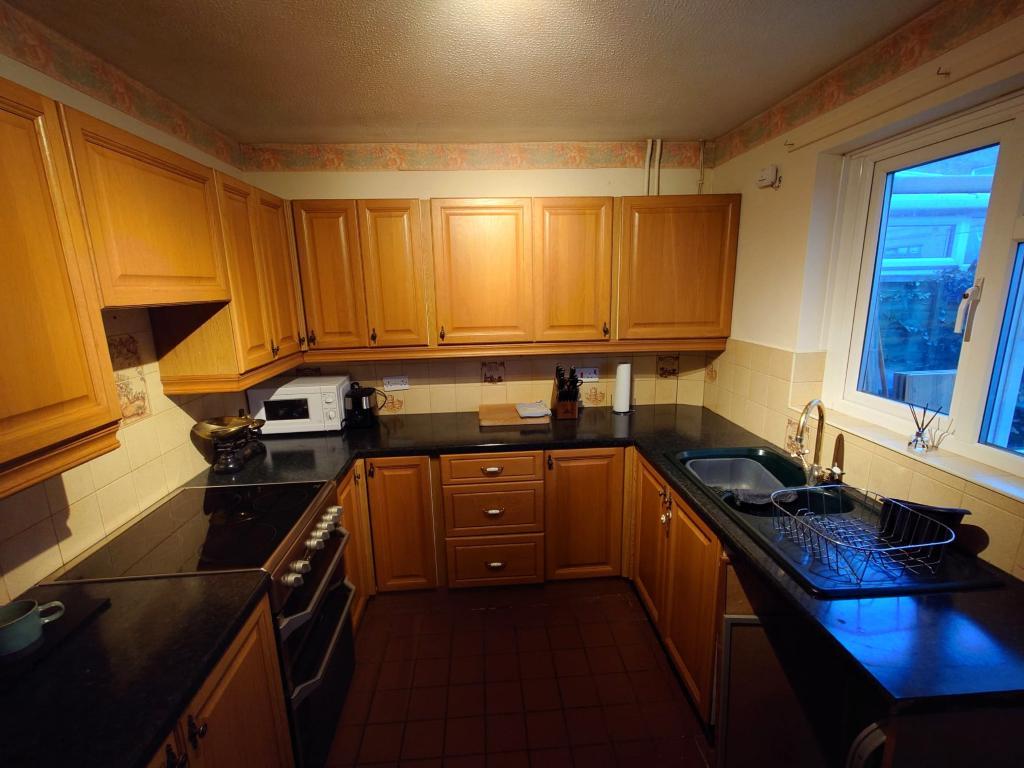 One and a half bowl sink unit adjoining work surface with wood fronted cupboards and drawer unit below. Space and plumbing suitable for washing machine under work surface. Space for cooker, matching eye level cupboards, part tiling, tiled flooring, double glazed window. Cupboard concealing gas boiler, double glazed door opens to:-