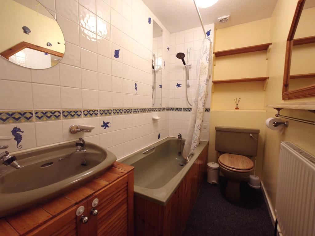 Panelled bath having grip handles with independent Triton shower over, wash hand basin set into vanity unit, part tiling to walls, radiator, low level WC, radiator.