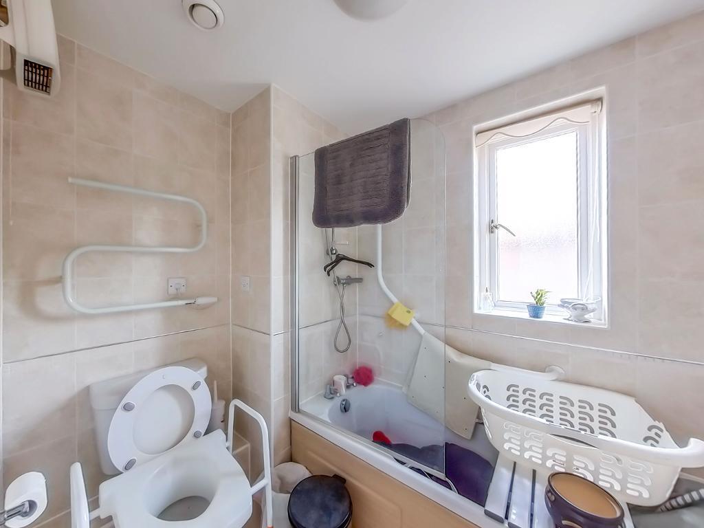 Paneled bath with grip handles with shower over and shower spray guard, wash hand basin set into vanity unit, low level WC, tiling to walls, double glazed window, fitted mirror, light/shaver unit, electric heated towel rail, electric heater.