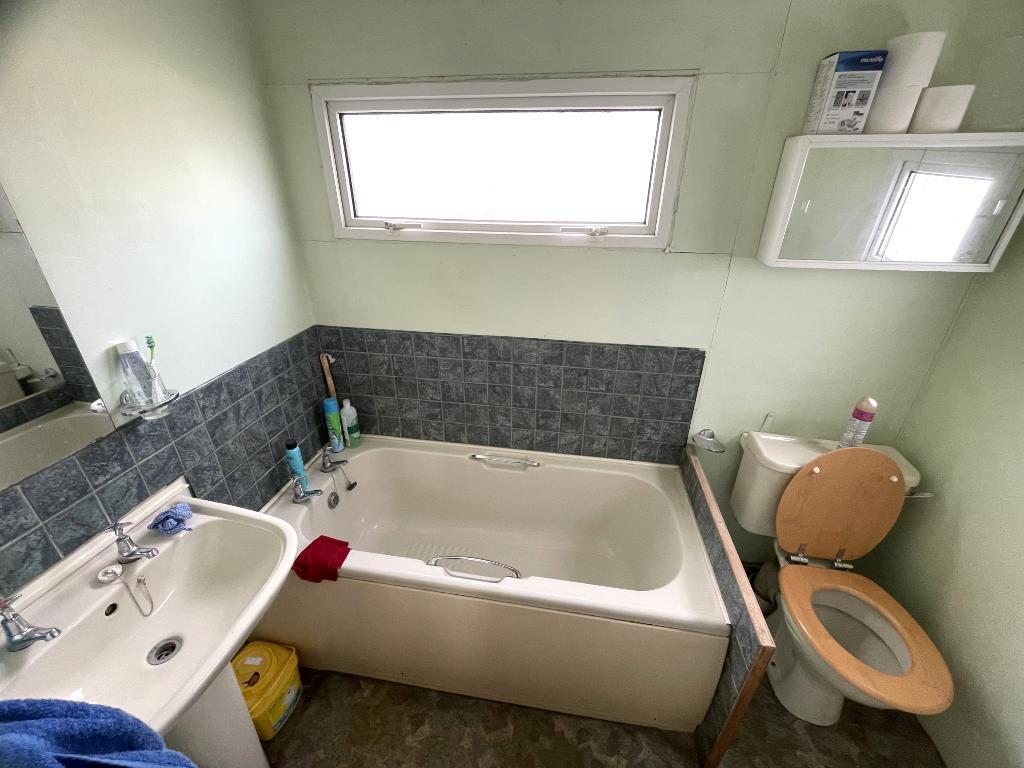 Panelled bath with grip handles, pedestal wash hand basin, low-level WC, double glazed windows, radiator.