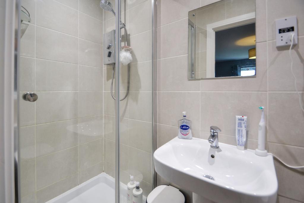 Tiled shower cubicle fitted with Mira shower unit, pedestal wash hand basin, shaver panel, WC, radiator/ heated towel rail, double glazed window, tiling to walls, spotlights, wood effect flooring.