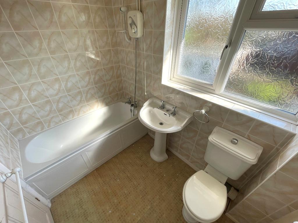 Panelled bath with independent Triton shower unit. Pedestal wash hand basin, WC, part tiling, double glazed window, mirror fronted medicine cabinet.