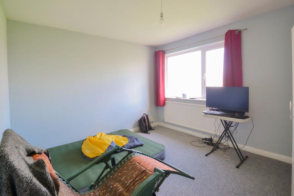 Double glazed window with view over rear garden, radiator, recessed shelved storage cupboard.