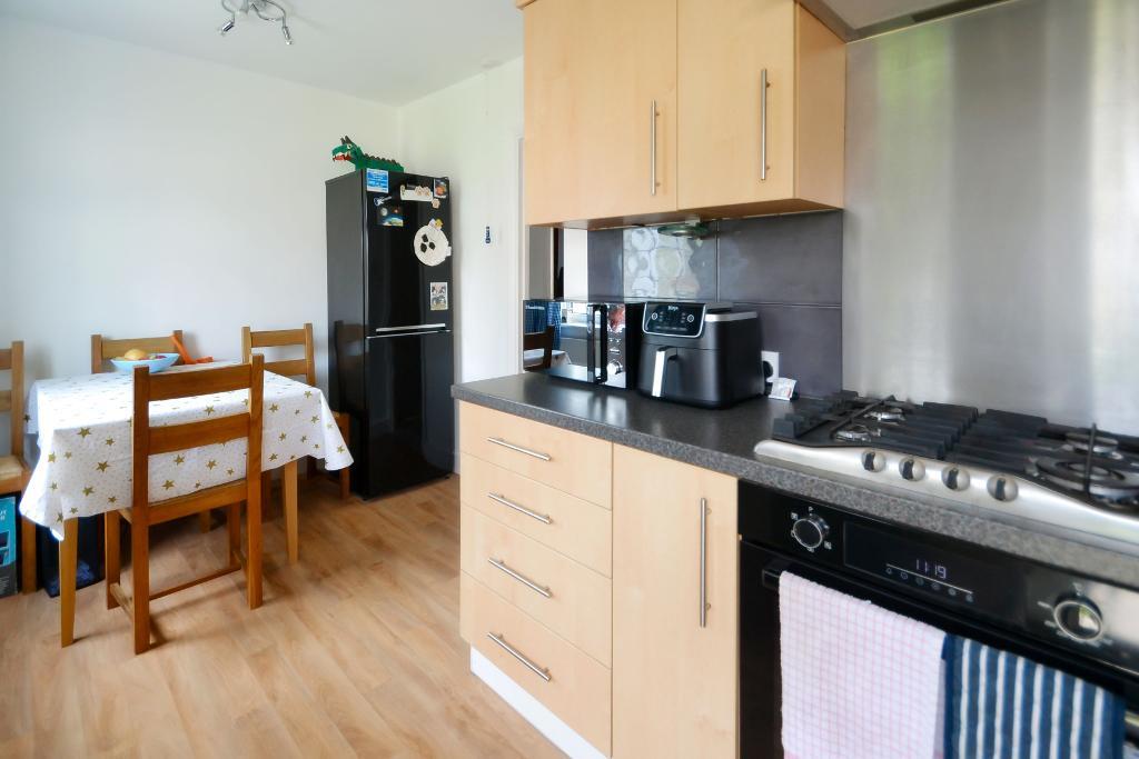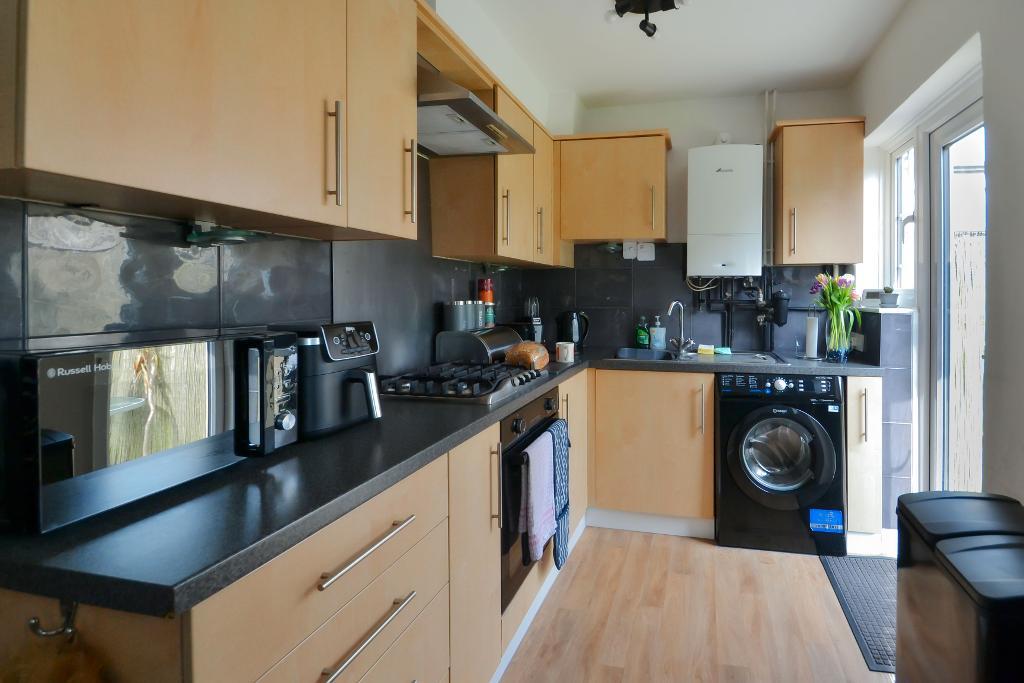 Single drainer stainless steel sink unit adjoining work surface with matching cupboards under and drawer unit with built-in gas hob with extractor above and built-in electric oven below. Part tiling above work surfaces, matching eye level cupboards, Worcester wall mounted gas boiler, vinyl wood effect flooring, radiator, double glazed windows, gas meter, double glazed door to rear garden.
