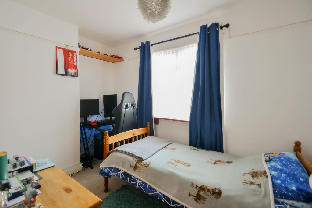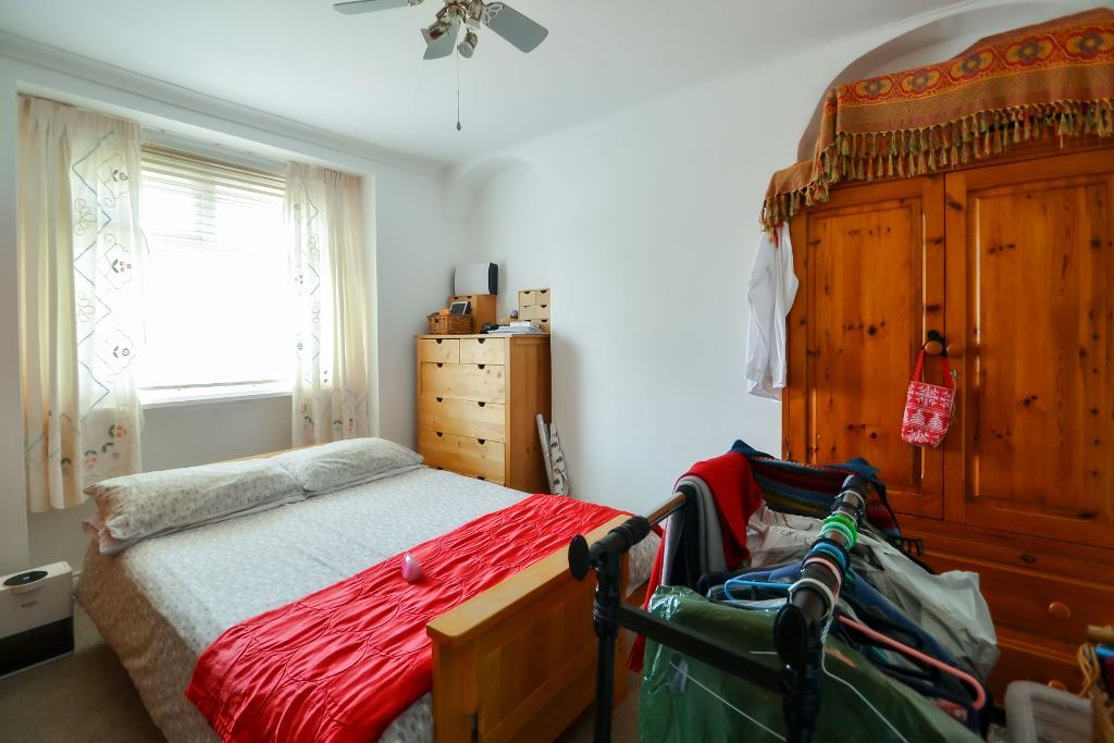 Double glazed window, radiator, recessed wardrobe cupboard with hanging rail and fitted shelving.