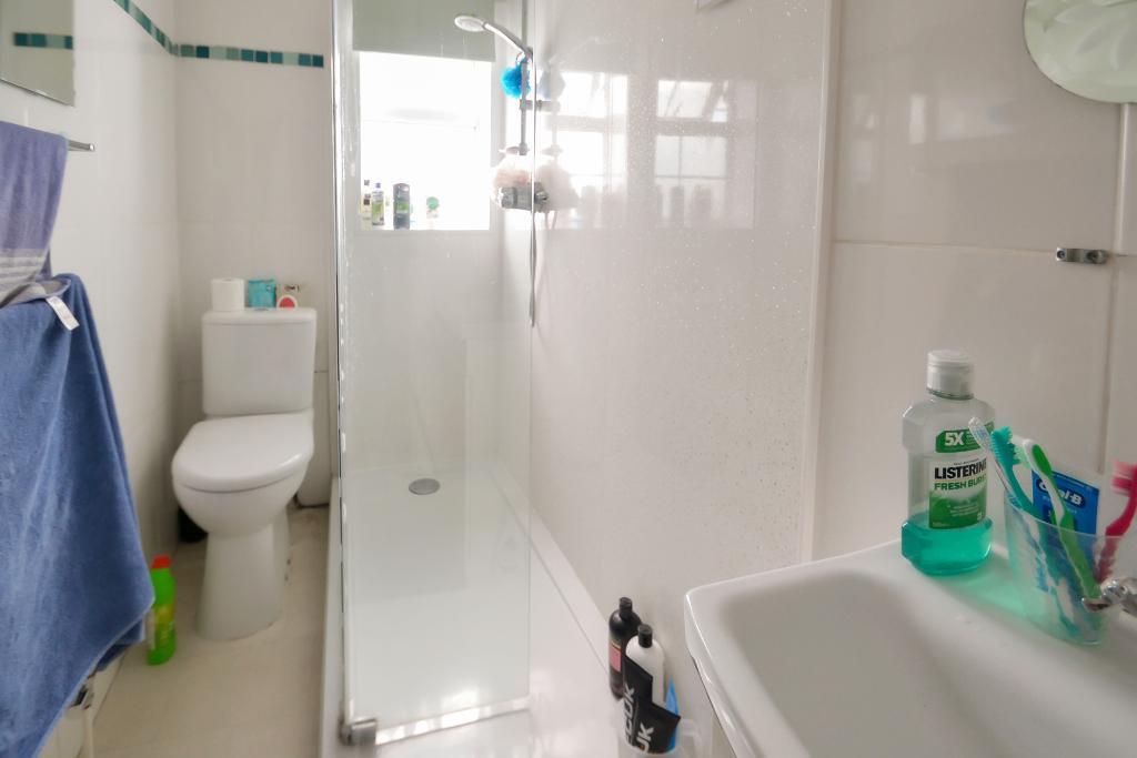 Walk-in shower cubicle, close coupled WC, wash hand basin set into vanity unit, part tiling, double glazed window, radiator.